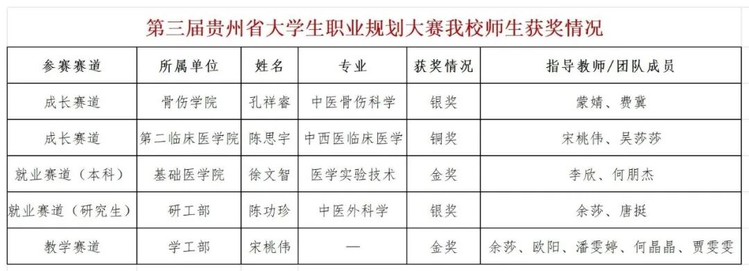 近日,“筑梦青春志在四方,规划启航职引未来”第三届贵州省大学生职业规划大赛总决赛在贵州民族大学举办。我校师生在比赛中发挥出色,荣获2项金奖、2项银奖、1项铜奖,教师团队获奖层次创下我校参加该项赛事的历史最佳成绩。